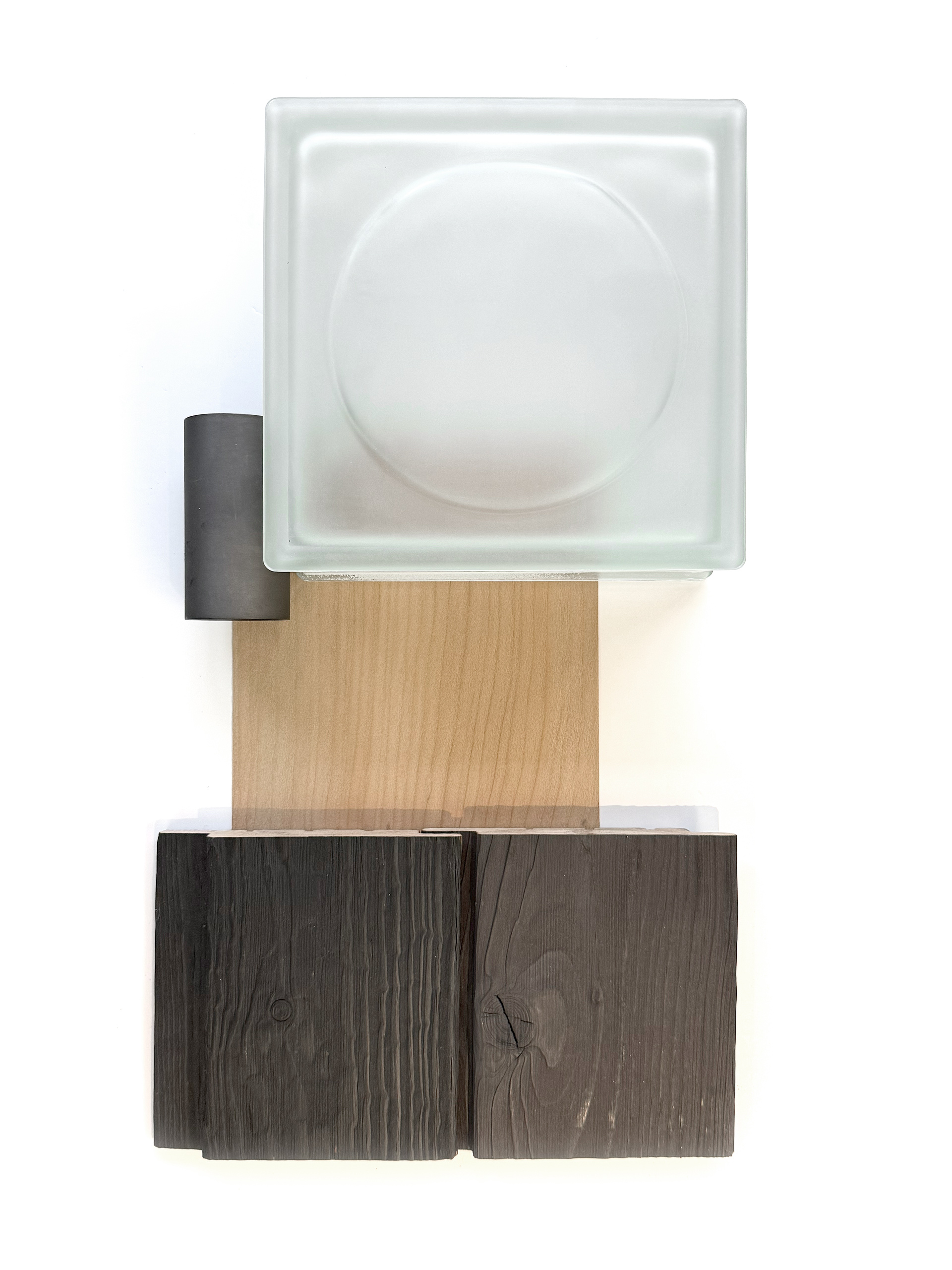 Selected material palette of cedar in natural and charred (Shou Sugi Ban) forms, and satin glass block walls evoking traditional Japanese Shoji screens