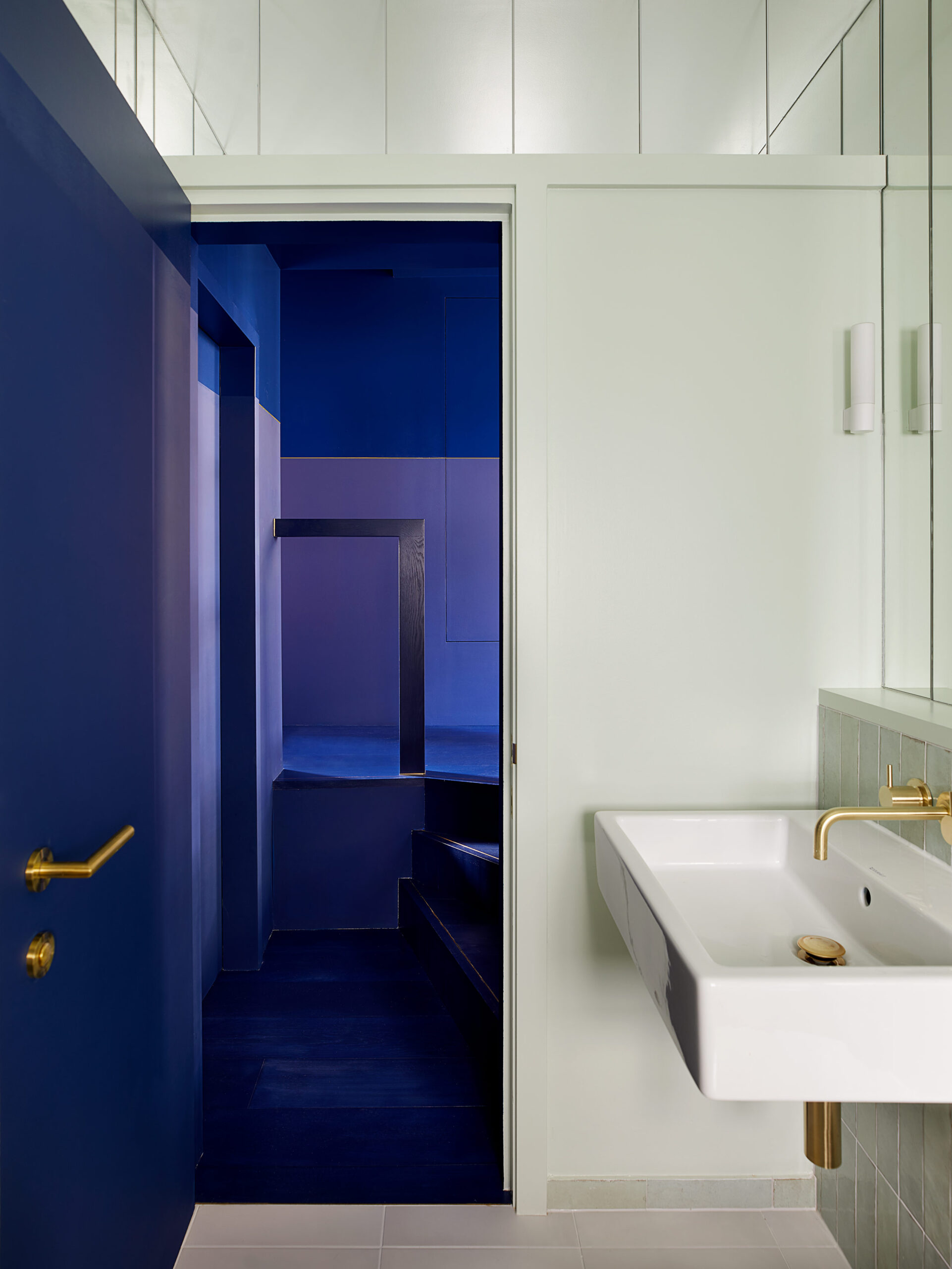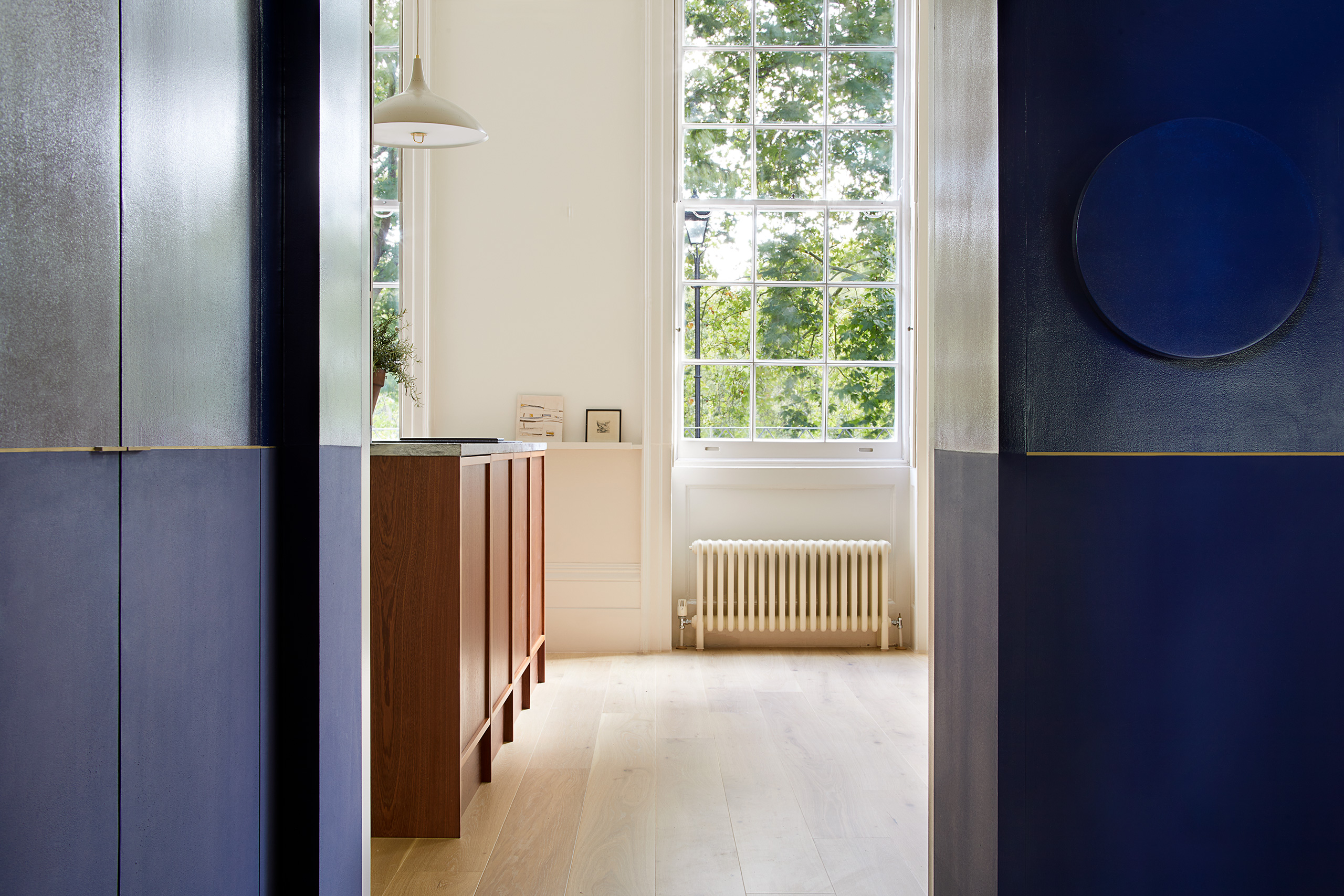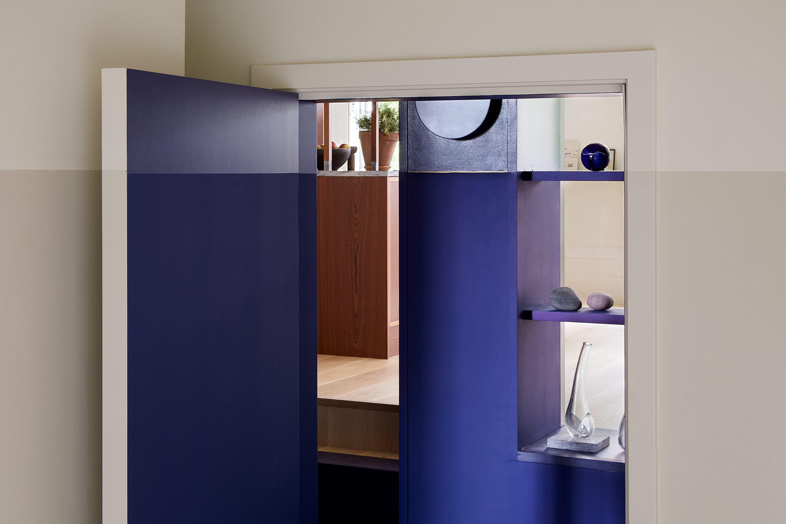 Everything aside from the brass datum is dark blue in this area. Not only are the walls painted blue (with matte paint below and gloss above the brass) but the flooring, which is the same timber as everywhere else in the apartment, is stained the same colour. Creeping beyond the thresholds of the doors, the blue flooring continues into the mainly neutral-coloured rooms so that when doors are open, the liminal space extends to bring views of greenery closer.