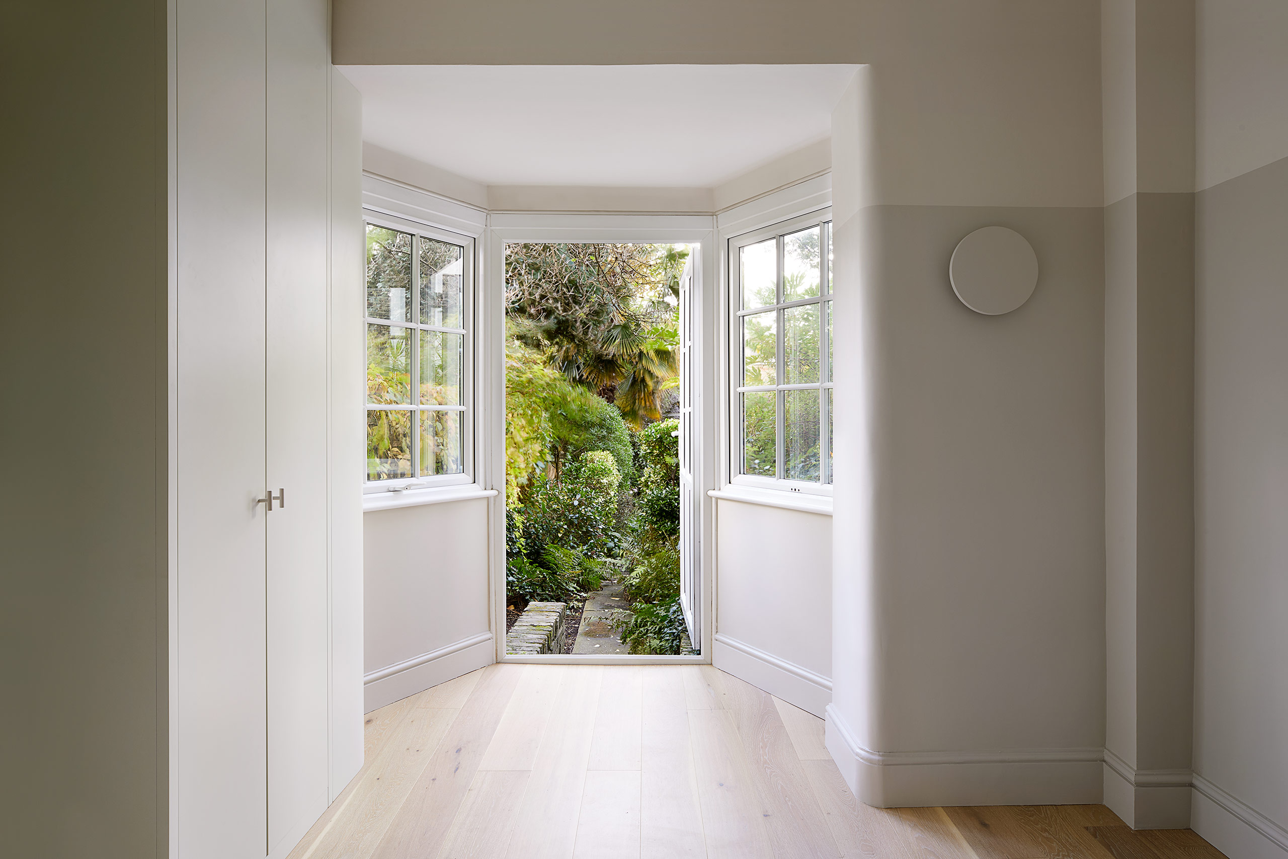 Our first step to improve the flat was very practical – convert what was the second bedroom into the master so that access to the garden could be via study/guest bedroom. This rearrangement meant that the master bedroom could separated and private whilst the door to the study/guest bedroom could be kept open most of the time. We recognised that a visual connection between living space and garden would be the most efficient (and cost effective) way to unite these spaces. This connection would work both ways and equally create a view of Highbury Fields from the rear rooms – almost dual aspect bedrooms (if you keep doors opened).