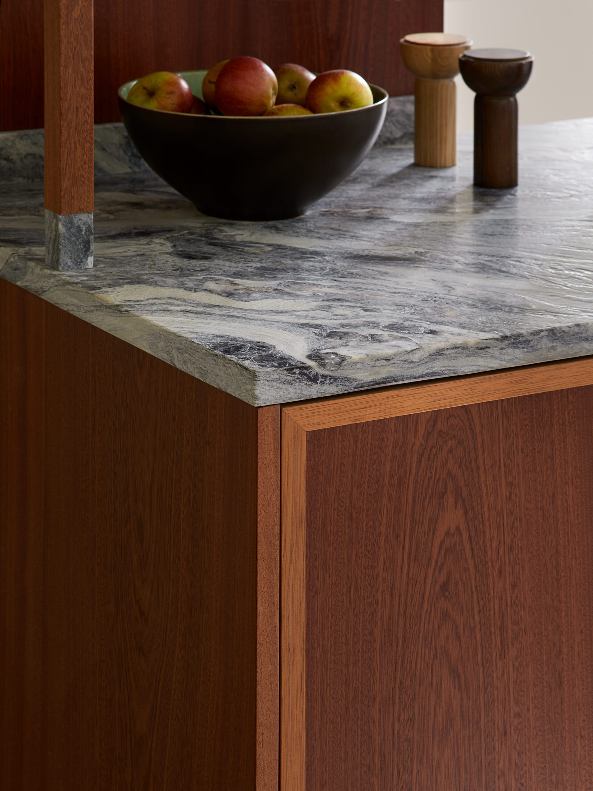 Marble upstand and plinth continuing datum treatment in kitchen worktop and shelving detail