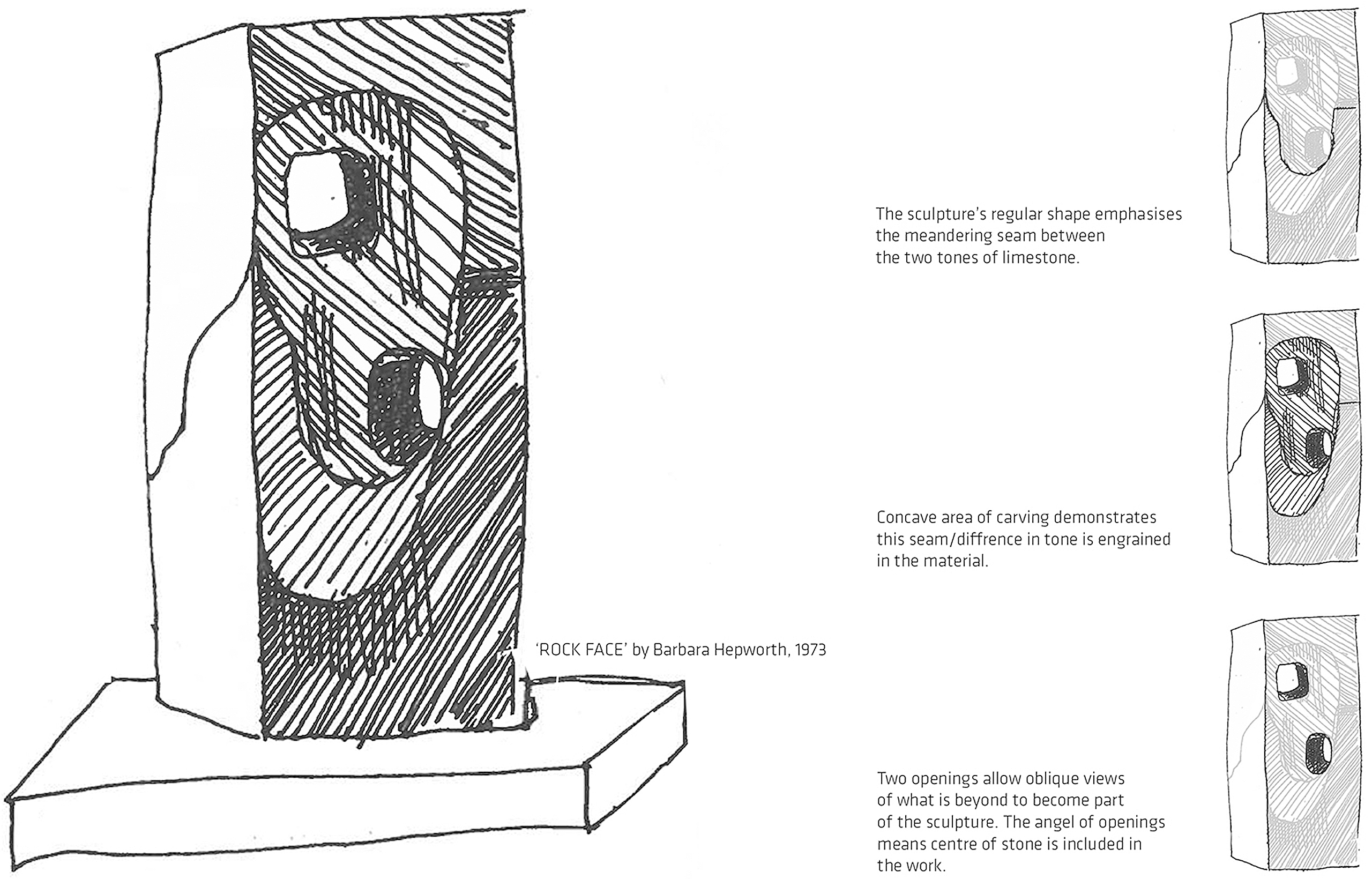 Perhaps it was an association with framed views in a beautiful garden, we decided to look at Barbara Hepworth’s sculptures for inspiration. A particular reference we found resonated with the flat was ‘Rock Face’, a later work carved out of Ancaster Limestone.