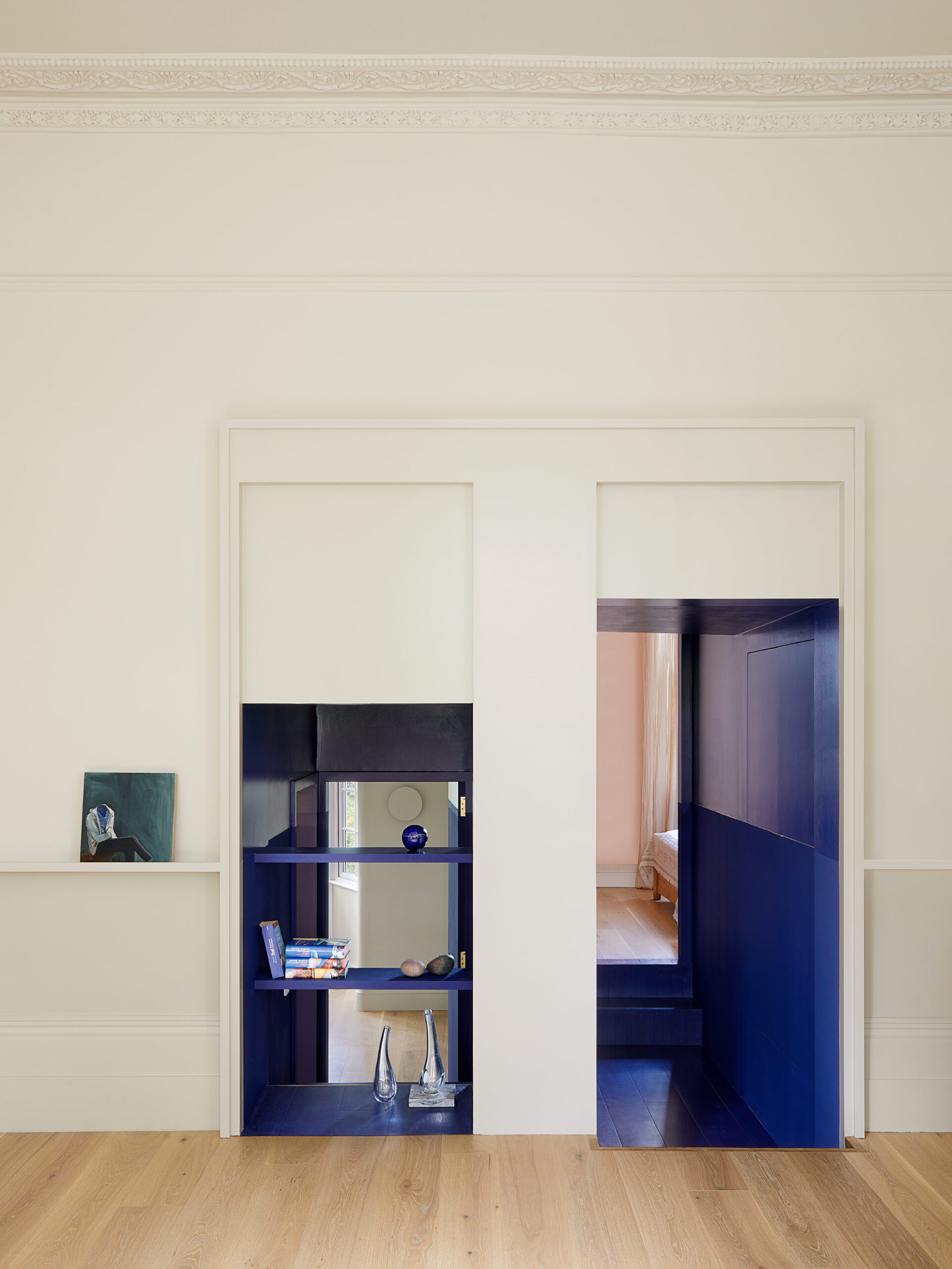 The division in kitchen treatment also helps to mask the lobby, as the peninsula is treated as a central piece of furniture whilst the wall-mounted units are sprayed to blend in with the wall colour. Sitting in front of the lobby, the peninsula includes panelled Sapele-veneered doors/shelving and a stone countertop. Small stone plinths elevate the shelving above potential liquid spillages and enthusiastic cleaning. The same stone is repeated on the fireplace heath and is a blue-colour to compliment the staircase colour.