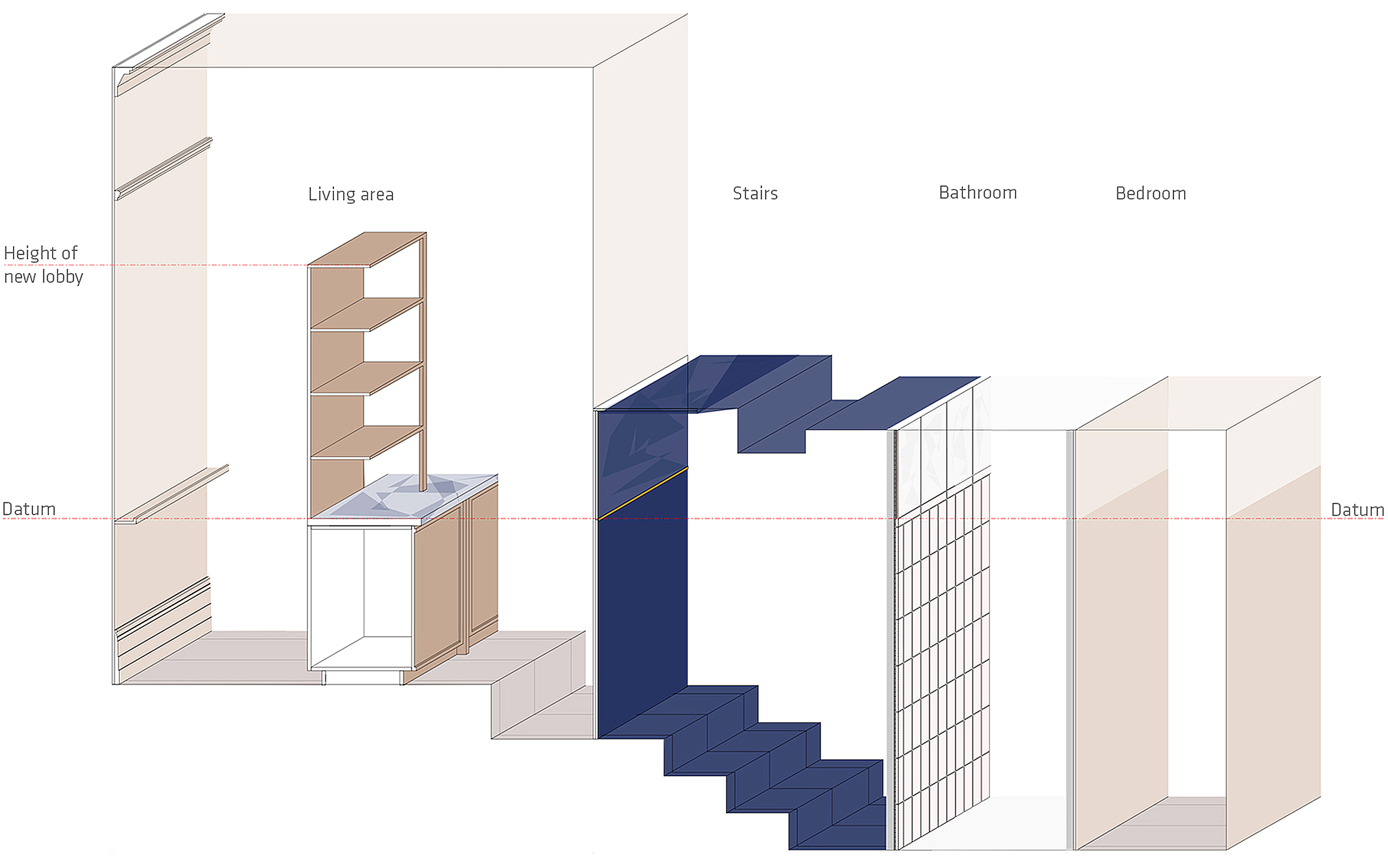 At kitchen counter-height in the living space and picture rail height in the bedroom, the datum is articulated in differences in paint colours, built-in joinery and a brass inlay that stitches the upper and lower halves of the staircase.