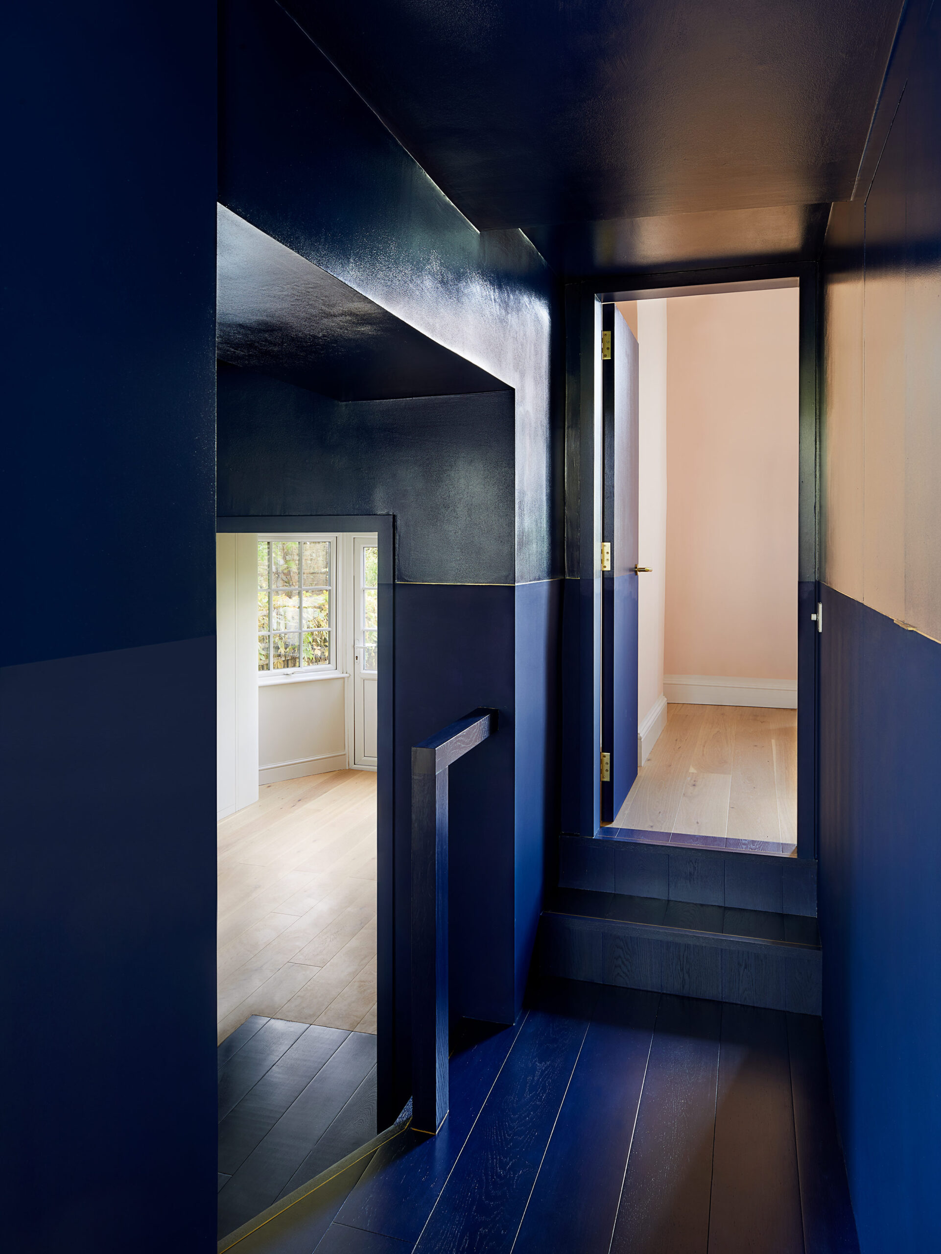 Liminal stair space. Everything aside from the brass demarcating the datum, is painted dark blue; matt below and gloss above the datum