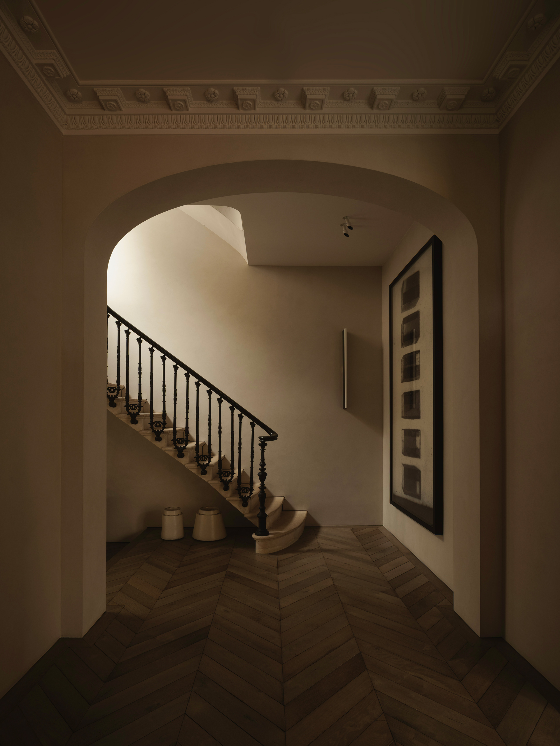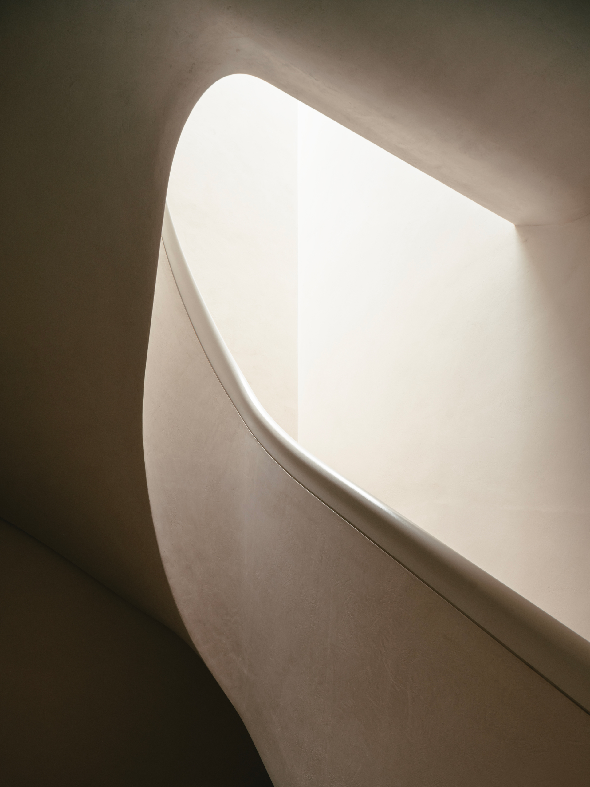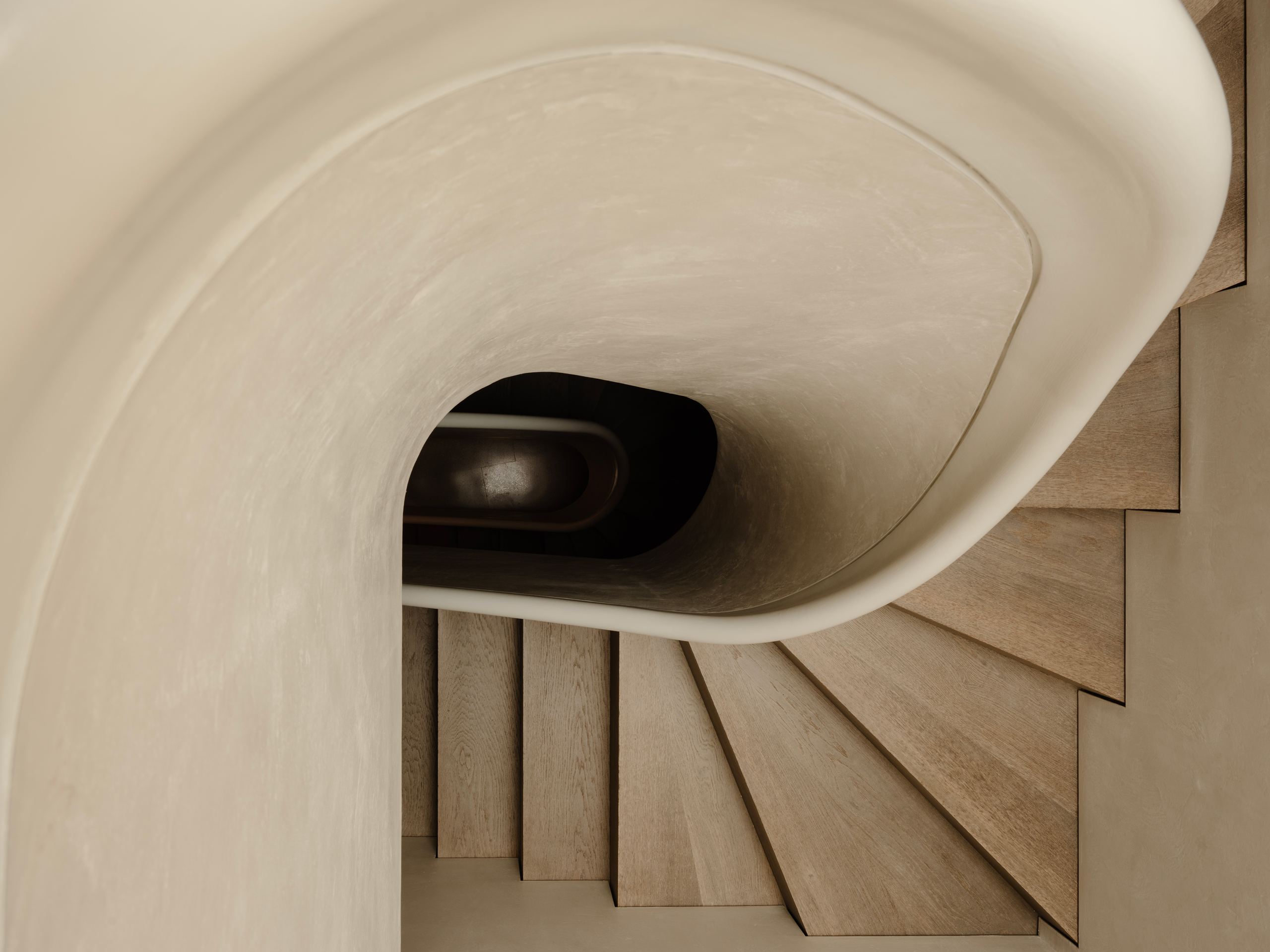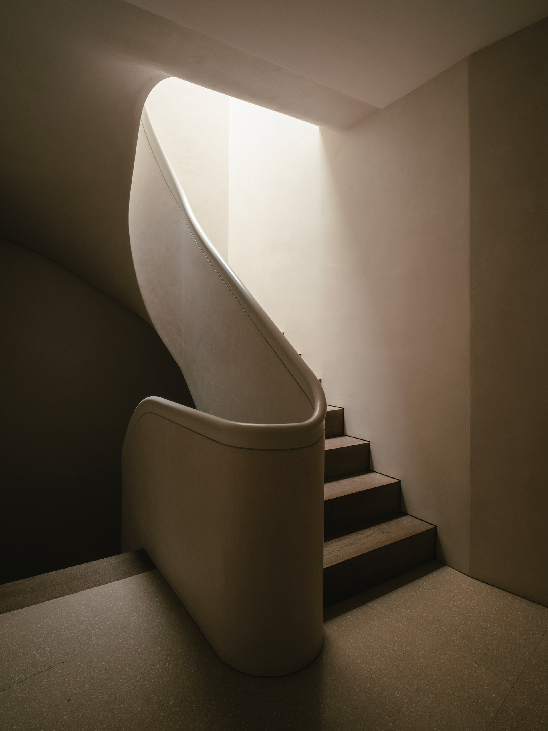 Soft light from above highlighting the sinuous curves of this new, bespoke stucco and timber staircase