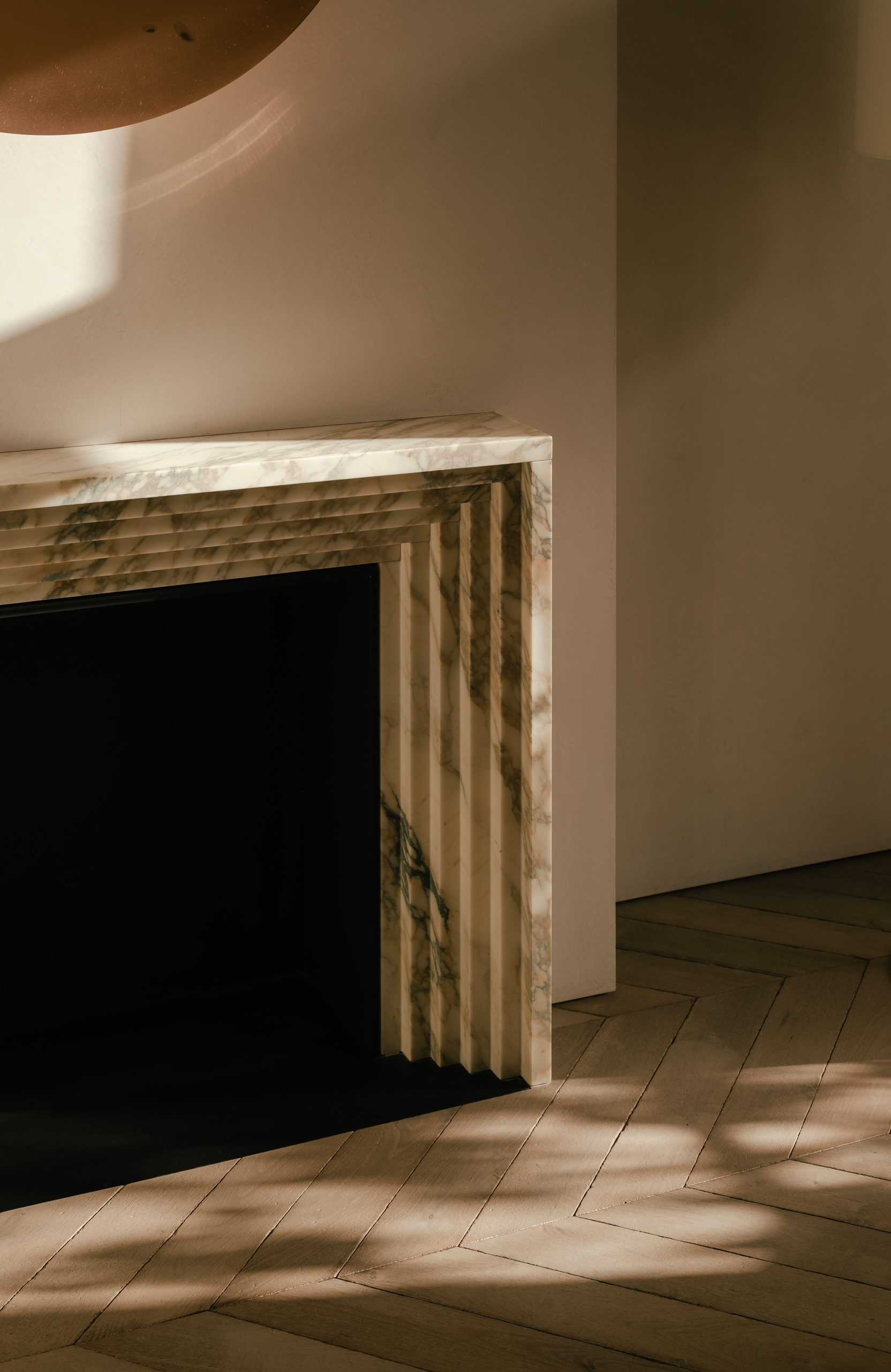Bespoke marble fireplace, highlighted with soft, dappled light passing through the front garden