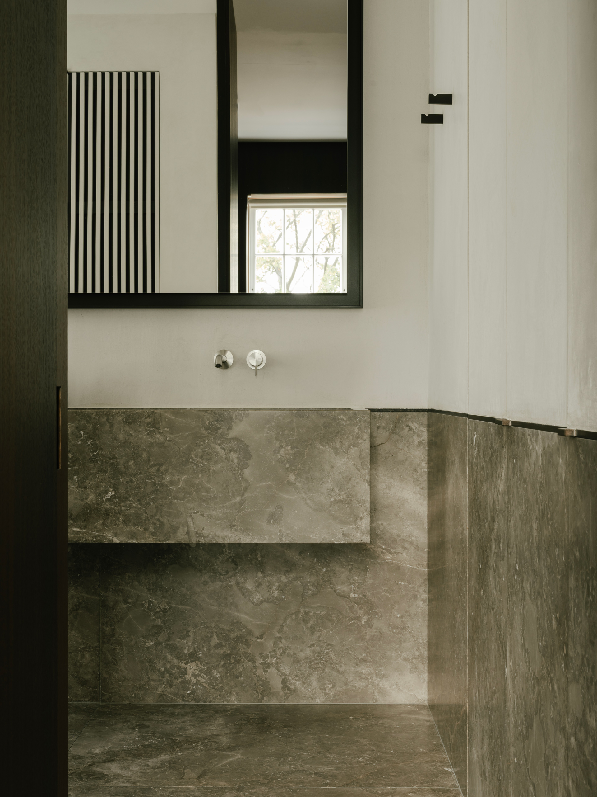 Carrara marble floor and wainscot, demarcated with patinated bronze datum forming a practical separation to the stucco above within this en suite