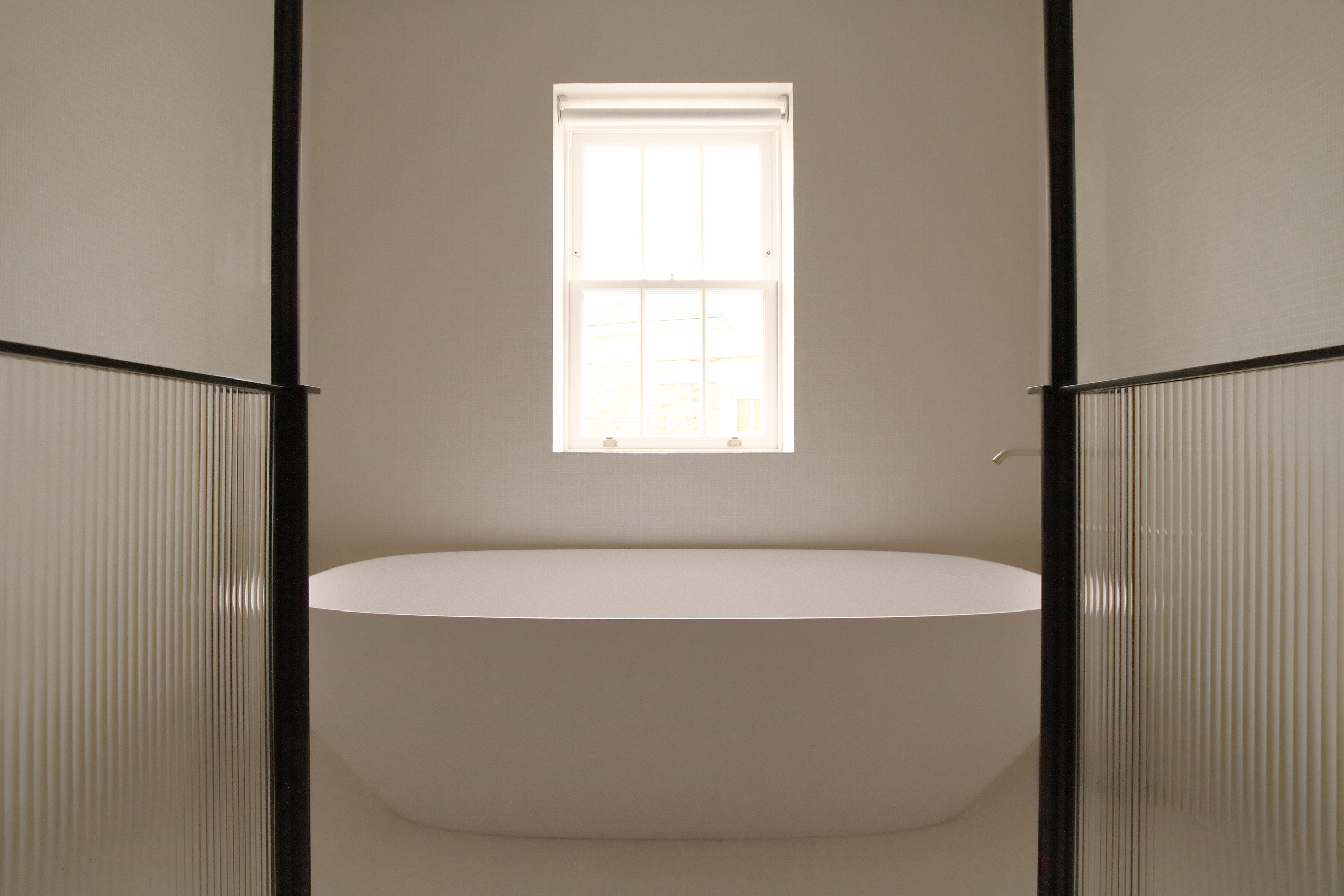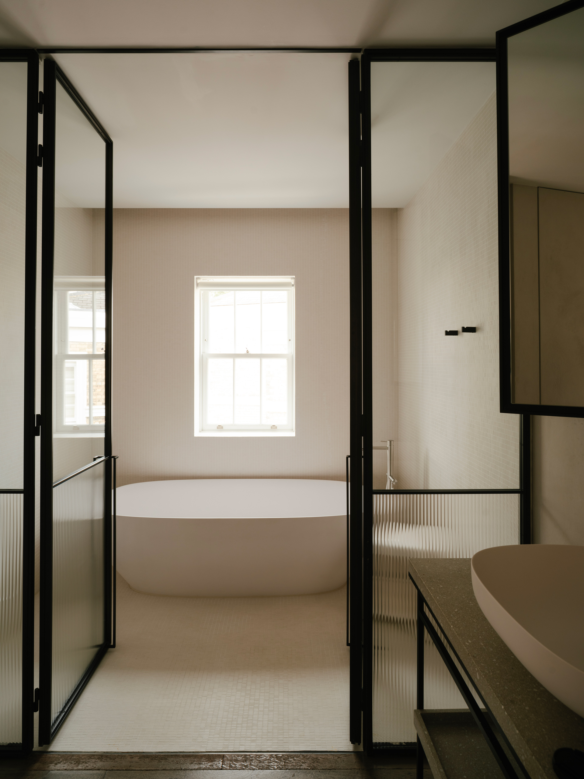 Entrance onto the family bathroom shower and bath area through bespoke, patined bronze-framed doors with reeded glass inserts
