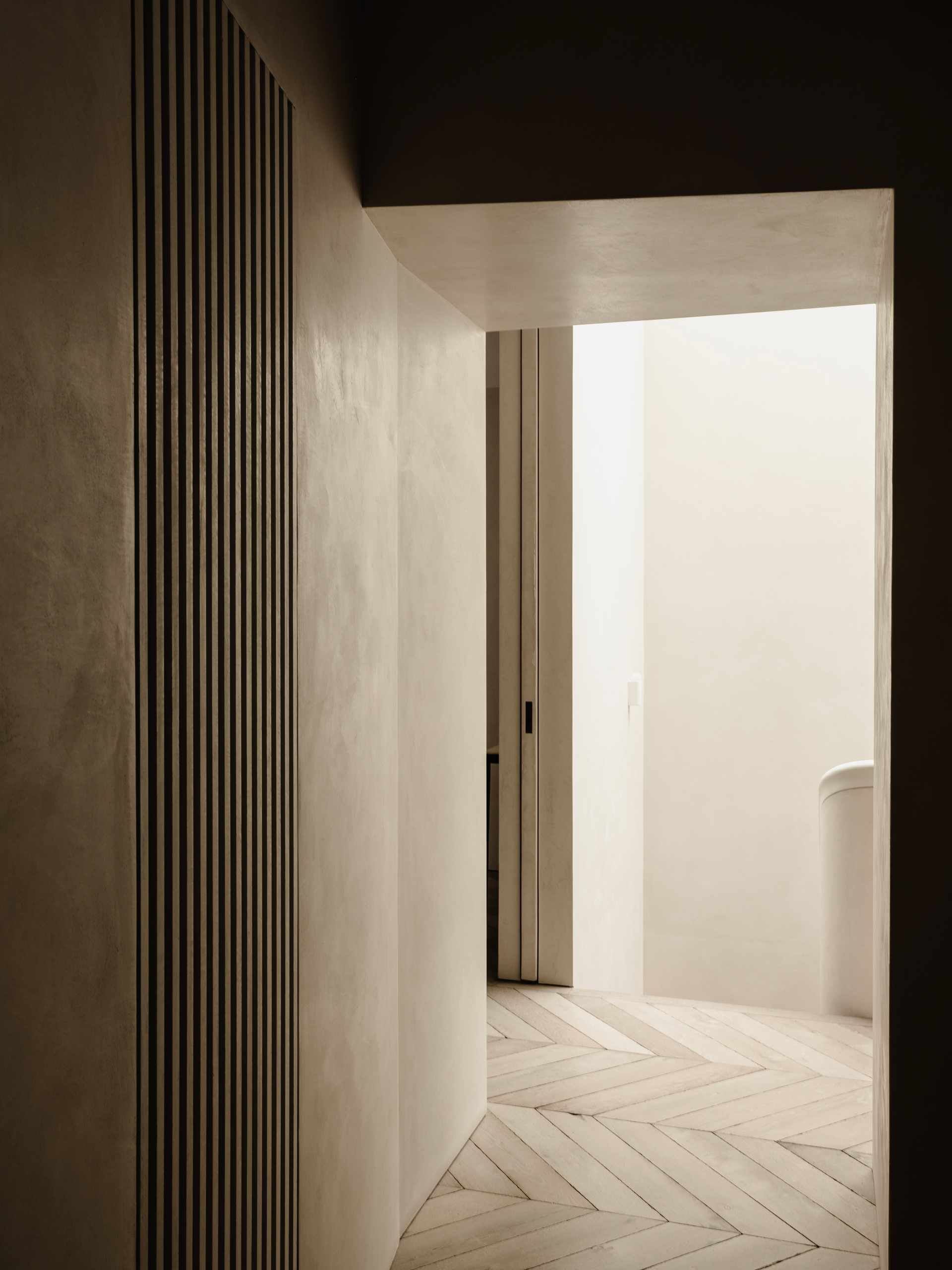 The project’s atmosphere is anchored by an uncompromising attention to detail and an exquisite, pared-down material palette. Tight tolerances and precise craftsmanship define the interior architecture; traditional skirting boards have been eschewed in favour of narrow shadow gaps to establish a crisp, minimalist aesthetic. Echoing the poetics of Jun’ichirō Tanizaki’s In Praise of Shadows, the interior scheme celebrates the delicate interplay of soft, natural light and deep shadow.