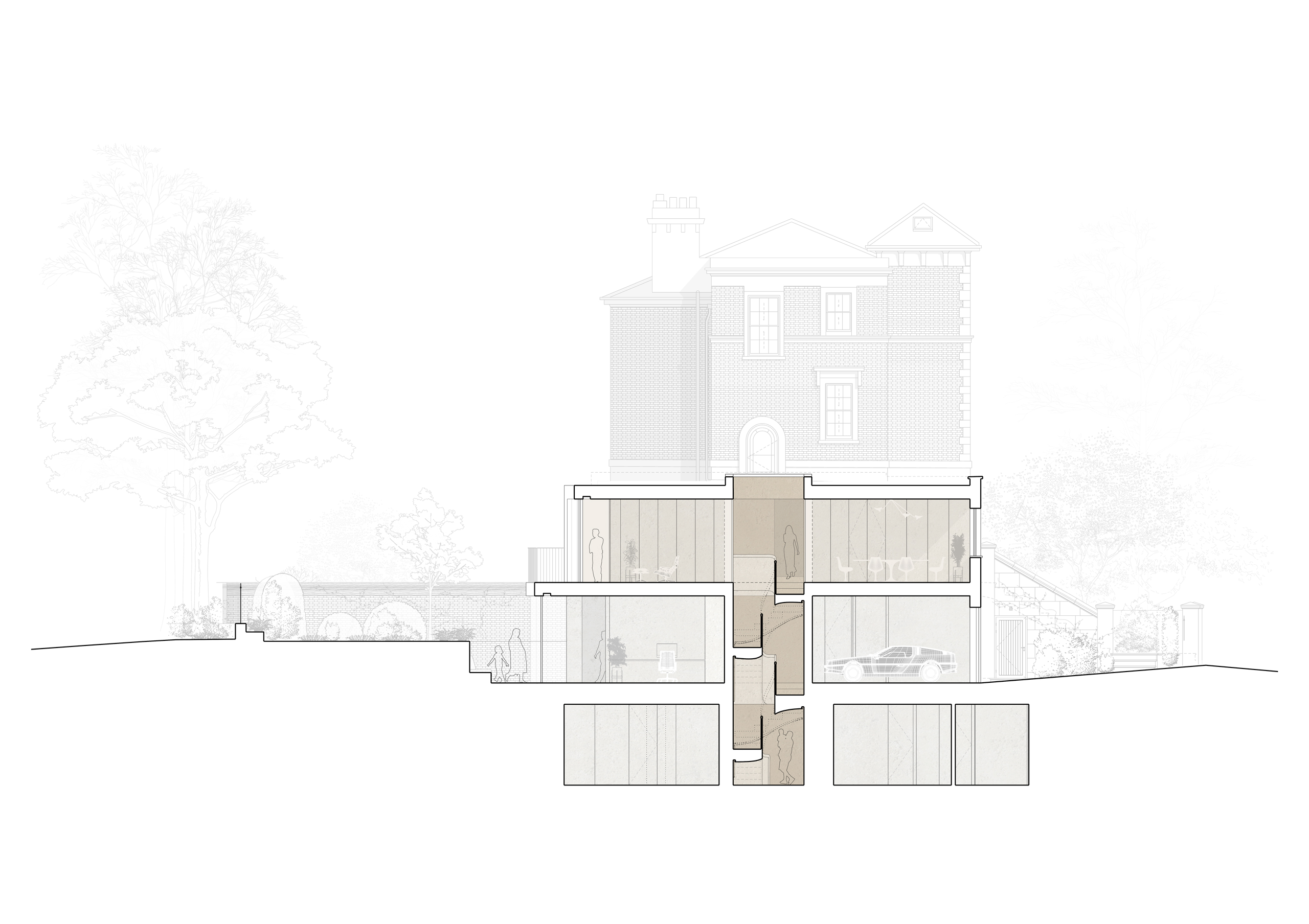 A key design challenge lay in reconfiguring the property to establish a more intuitive relationship between the living spaces and the surrounding site. By lowering the existing lower-ground slab in tandem with the new basement excavation, we achieved vastly improved ceiling heights and an elevated spatial quality at the heart of the home.
