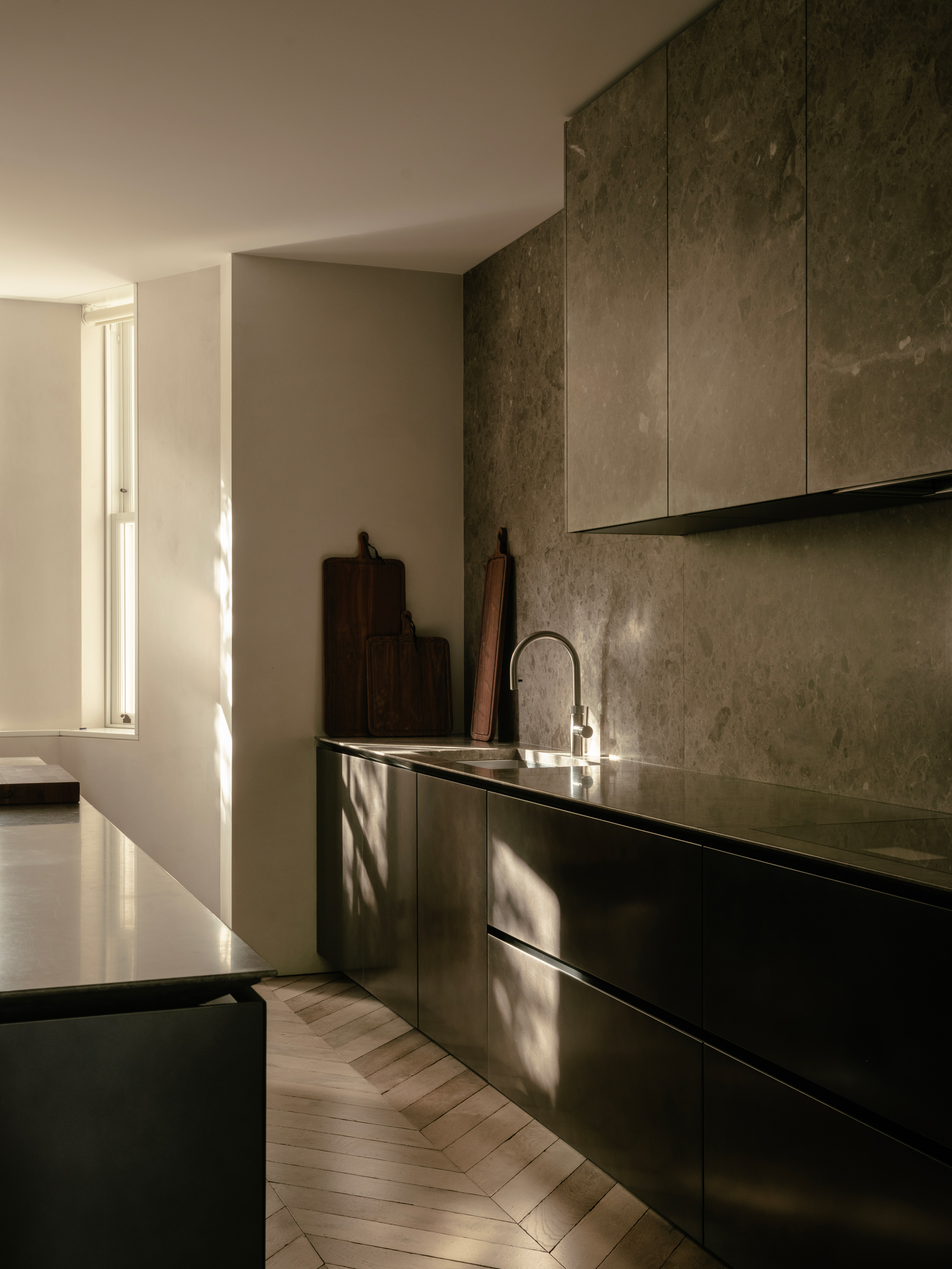 Pared-back material pallet and minimal detailing, highlighted by the dappled light here in the kitchen