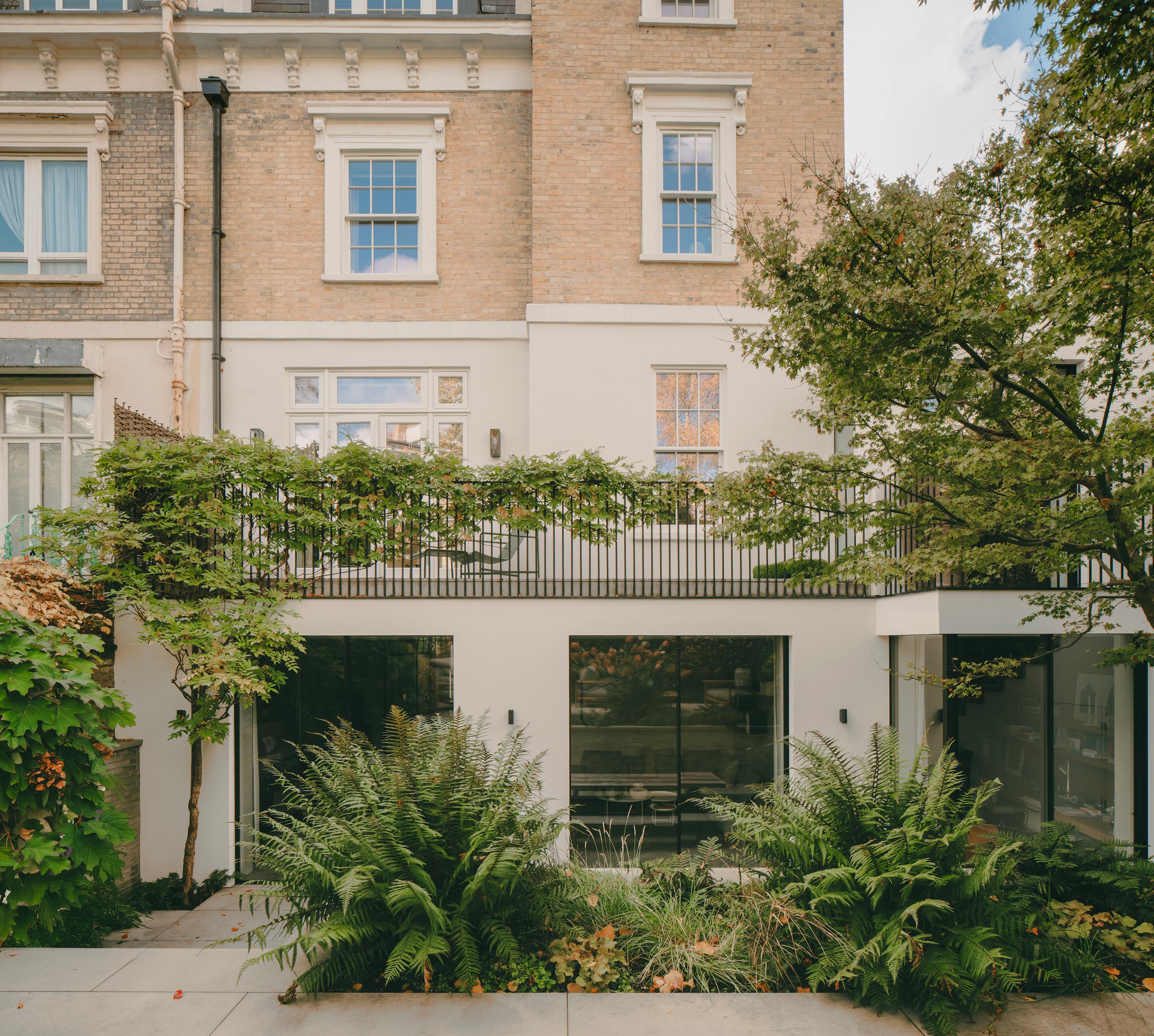 Rear elevation of rear and side extensions, featuring floor to ceiling glazing maximising natural light and views onto the verdant rear garden