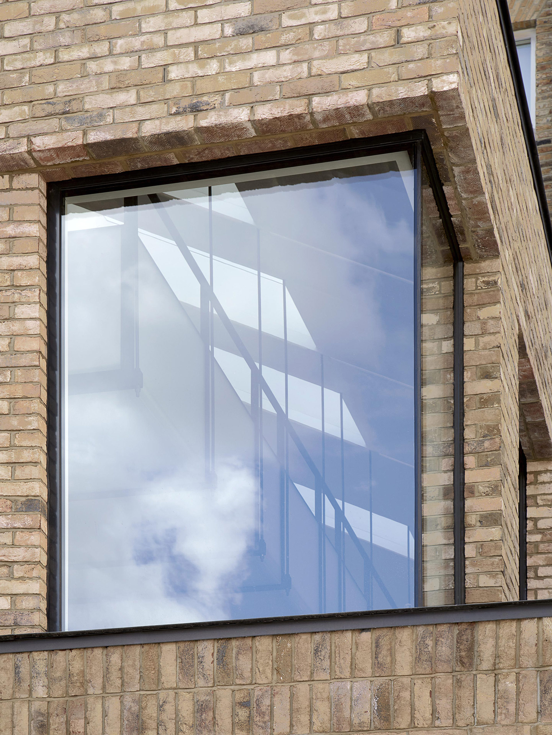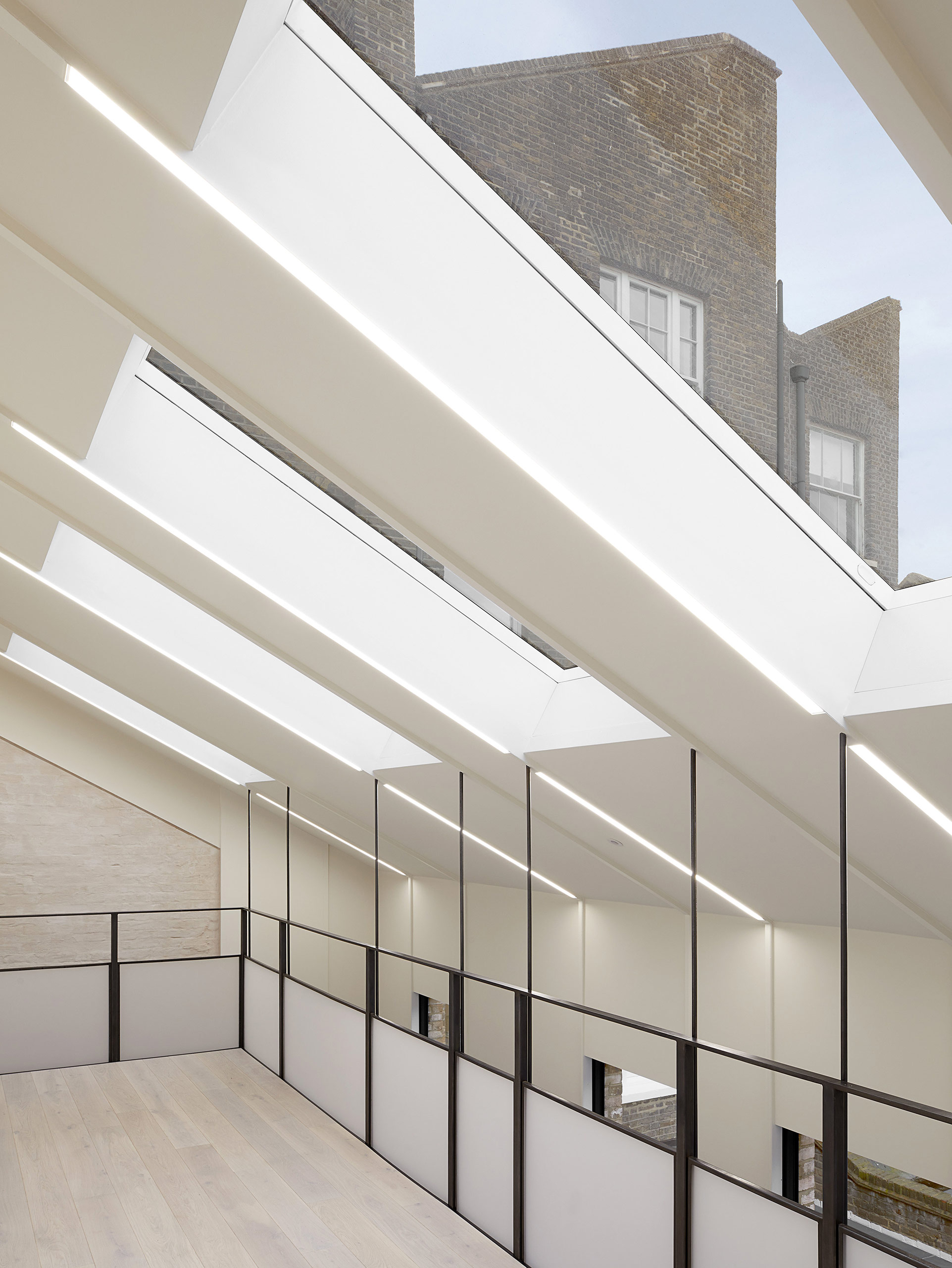 The characteristic butterfly roof to the existing building informs the volumetric expression and chamfered brick reveals of the sensitively proportioned rear extension, which compliments the surrounding materiality. Whilst internally, light canons flood the new spaces below with daylight and offer a glimpse to the historical butterfly roof geometry above.