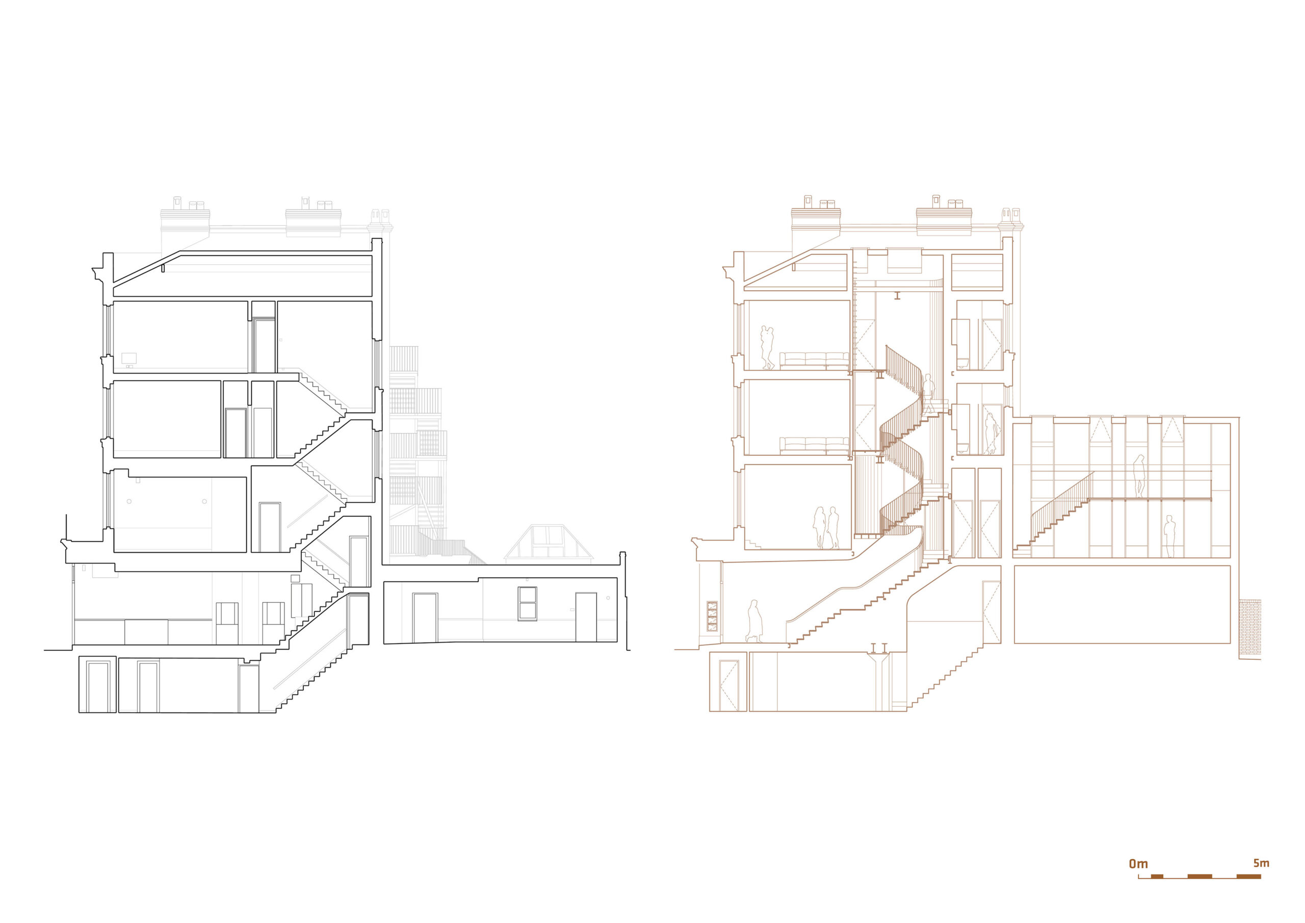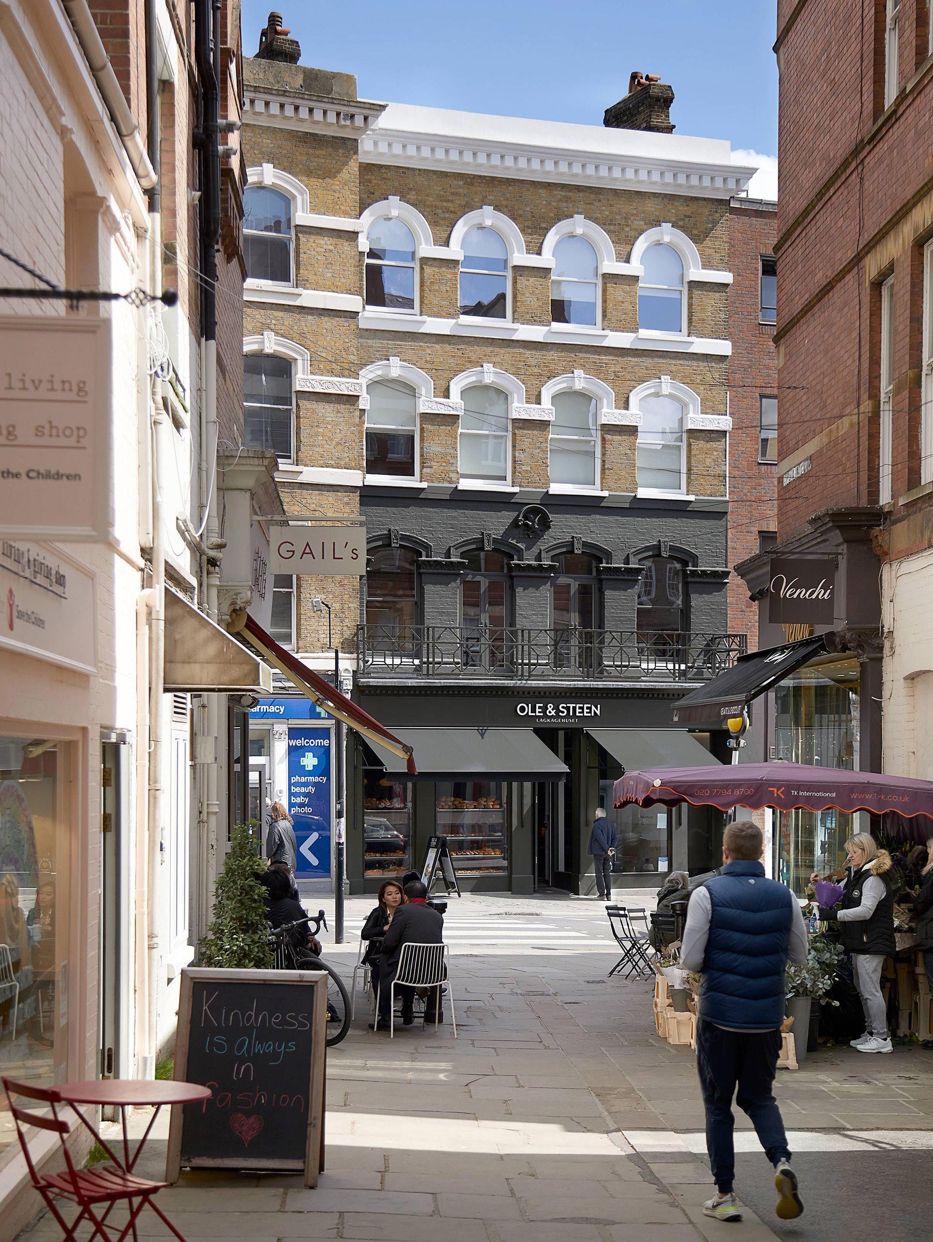 Architecture often begins with understanding and embracing the constraints of a particular brief and site. This proved especially true for the reconfiguration and extension of an existing building in Hampstead in North London, where – given its prominent yet nestled position between Hampstead High Street and Bird in Hand Yard – space was considerably confined. The Bird in Hand, once a local watering hole of Hampstead until it changed hands to The Dome cafe in the early 80’s and later Cafe Rouge, is a five-storey Victorian structure, which included two cramped flats to the upper floors, accessed via an external escape stair to the rear. It has been refurbished and extended to create retail units on the ground and basement levels, offices on the first floor, and two residential flats on the upper levels.