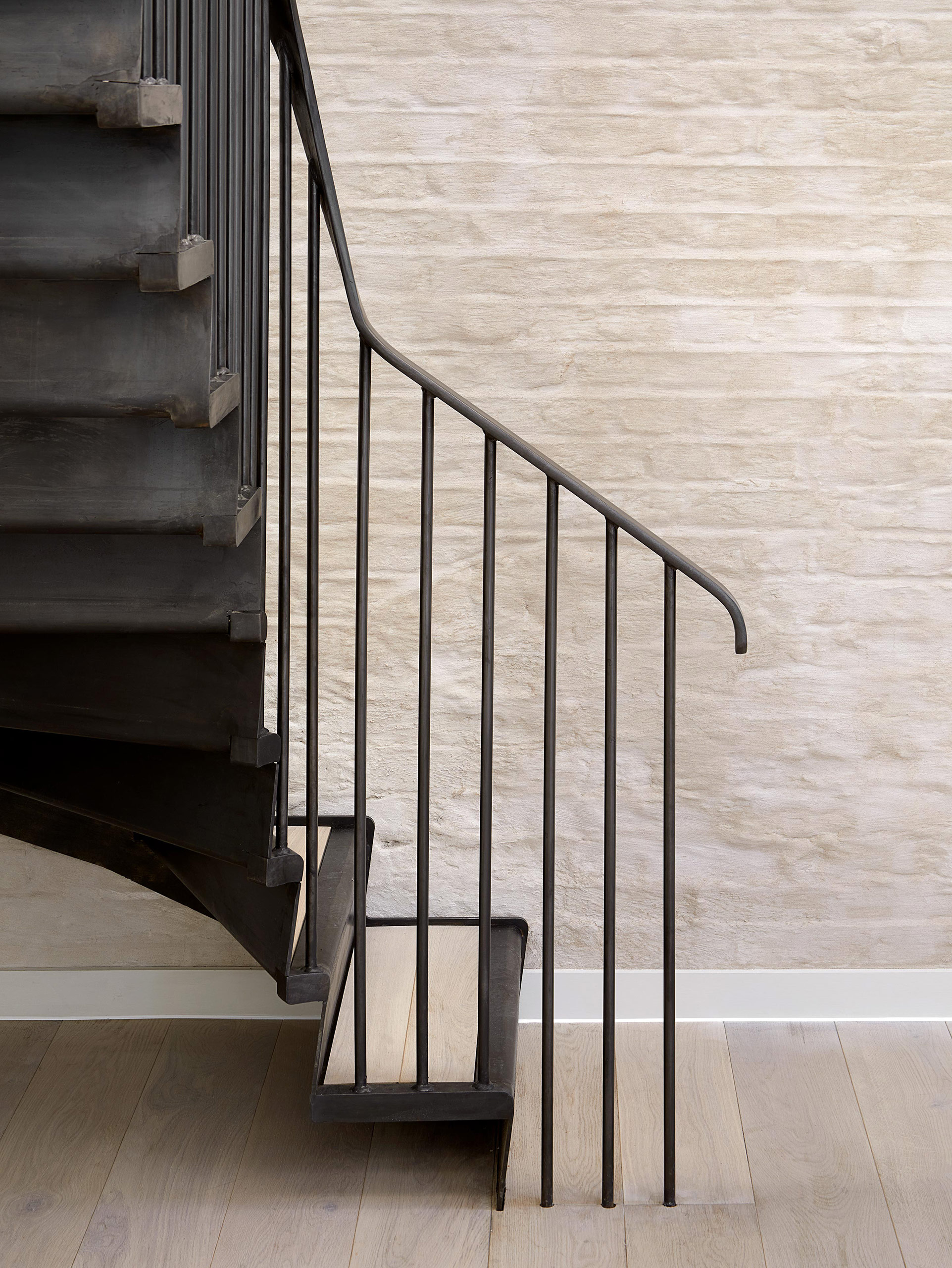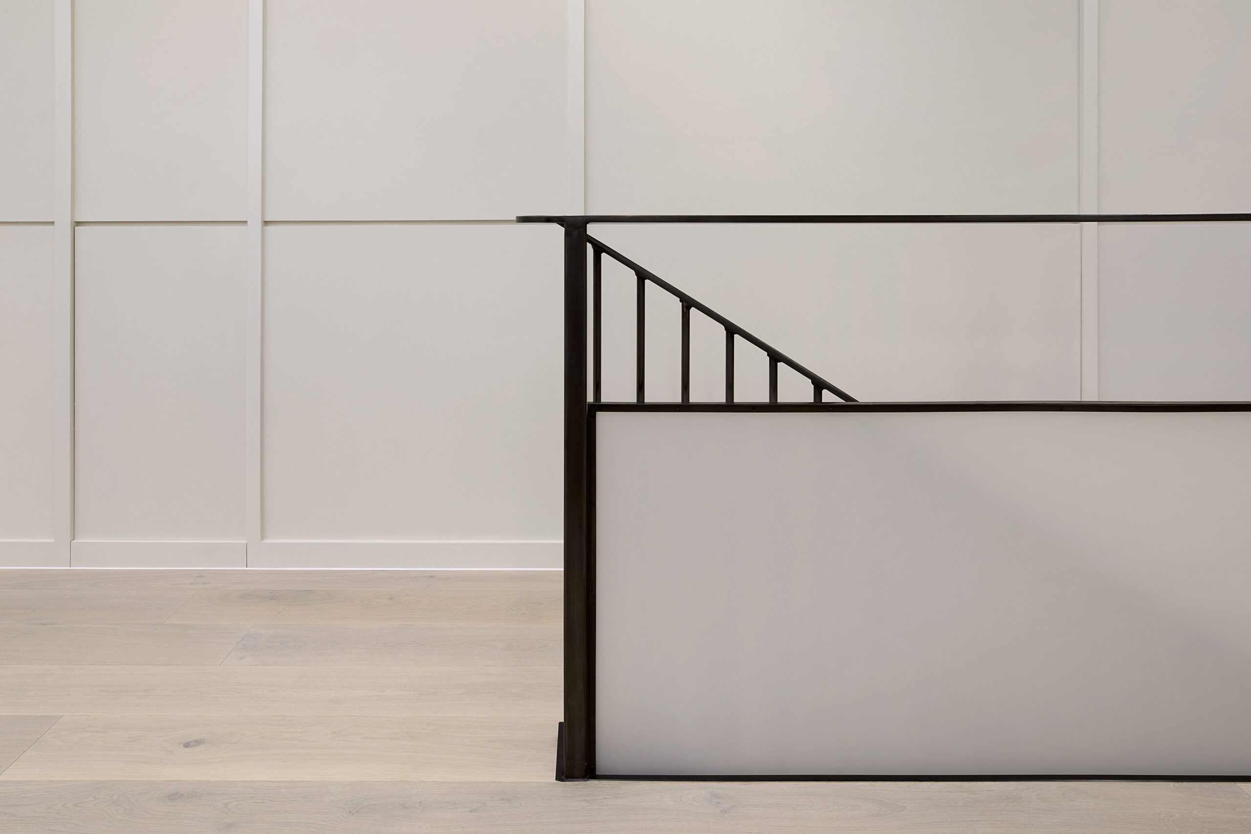 Encouraged by the refined proportions of the rear extension and mezzanine, this 40mm structural motif and materiality was echoed in the detailing of both the residential units and the new, waxed mild steel cantilevered staircase to the common area. Fabricated by Weber Industries and developed using a diverse range of traditional and contemporary design tools, the stair’s helical geometries and steel construction methods were also adopted to negotiate the generous floor to ceiling heights and challenging spatial constraints. The solid balustrade from entrance level elegantly transitions into an open one at first floor level, gradually demarcating the change of occupancy as one ascends from office use to residential on the upper two floors.