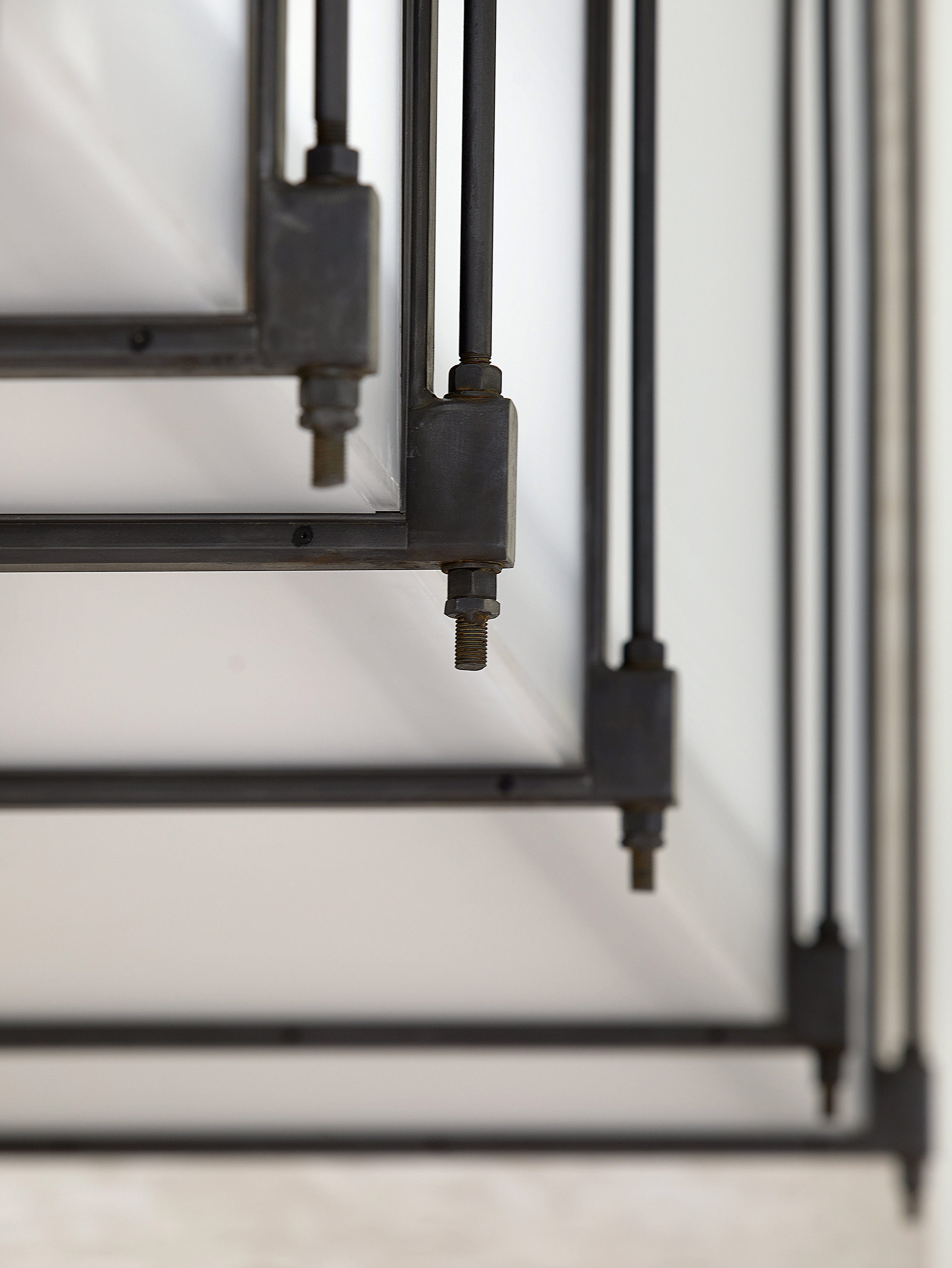 The constraints informed a spatially economical yet refined approach to all aspects of the design; from the overall structural arrangement to the construction details. Working in close collaboration with structural engineers Michael Hadi Associates, this approach was articulated most elegantly through the evolution of the rear extension design. The resolution of the mezzanine support lead to distributing the structural load through a series of reduced, 40mm wide portal frames on which a series of suspension rods delicately poises the mezzanine level within the modest, mono-pitched volume. Inspired by the beautifully considered details of Carlo Scarpa and Japanese shoji screens, the fine, waxed mild steel structural components are celebrated and expressed through the playful junction details and complementing opaque resin infill panels.