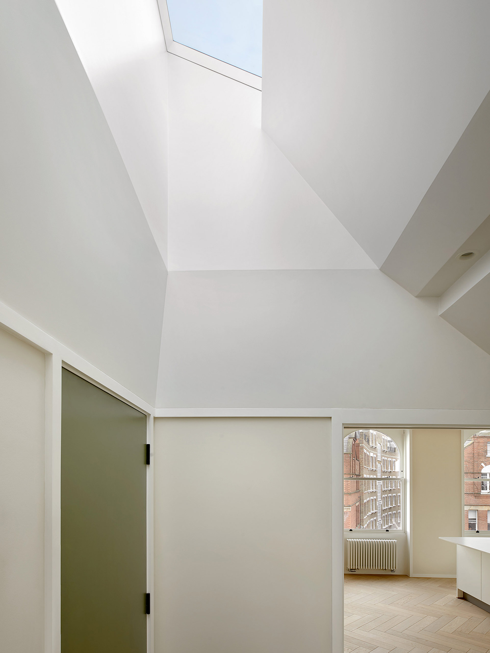 Completed third floor flat; light canon flooding entrance lobby with natural light and creating connection to the existing volume