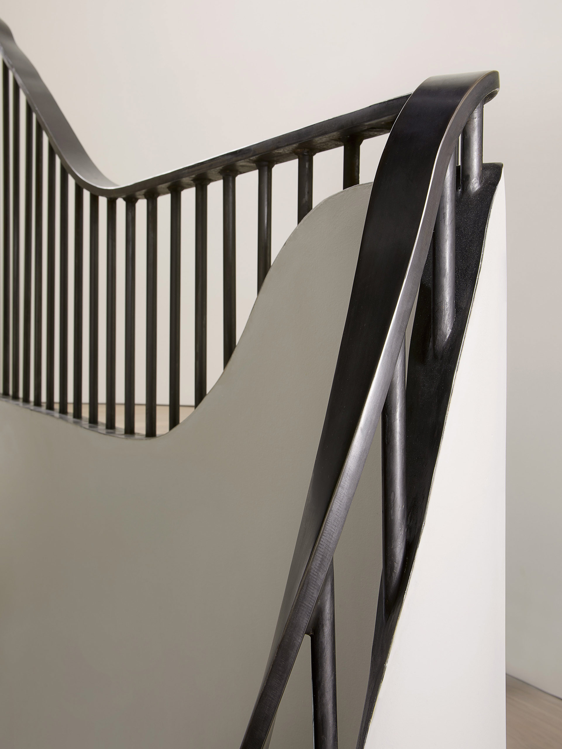 Completed common area staircase; transition section between solid balustrade at ground floor level to open balustrade above, and 40mm structural motif expressed