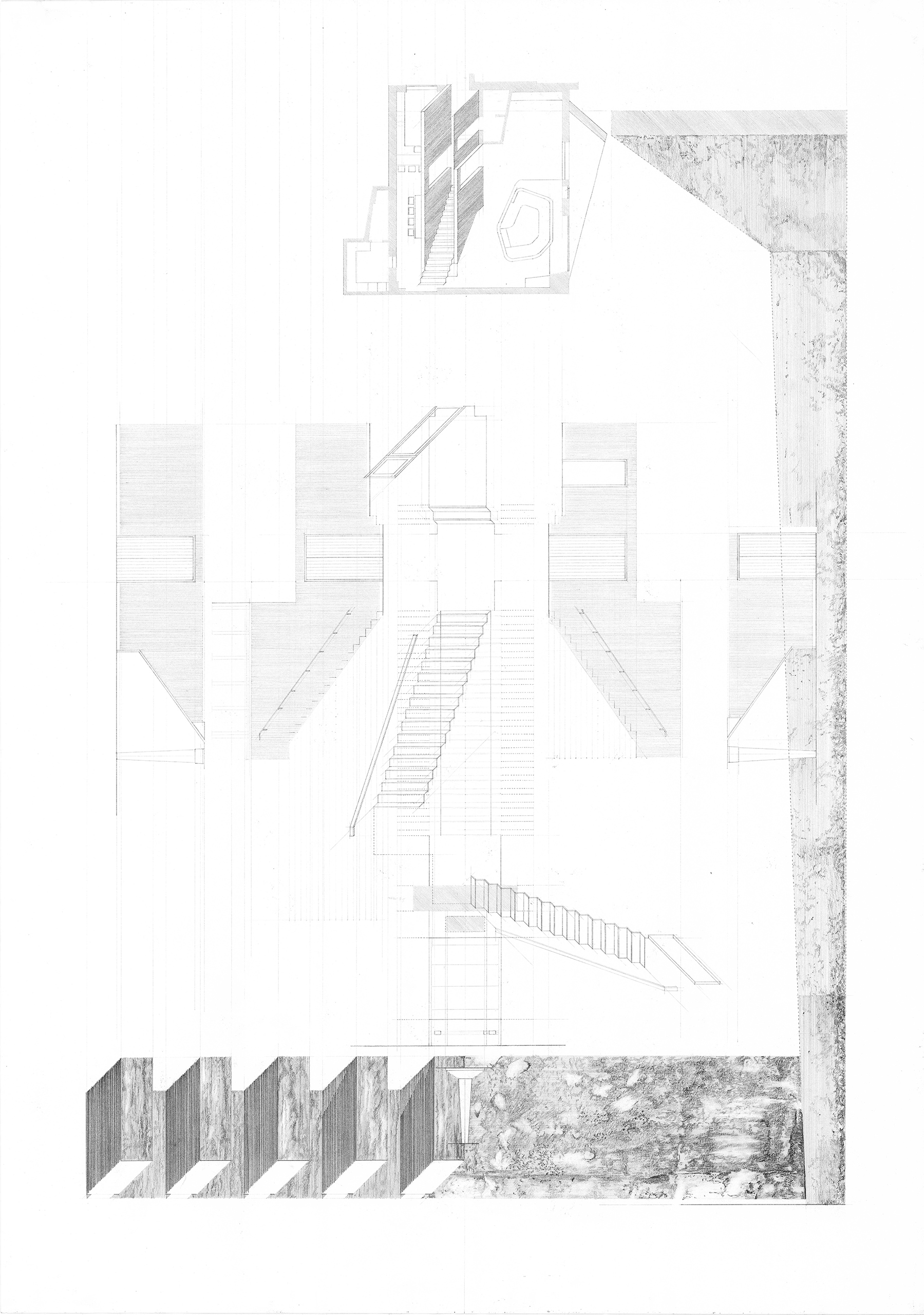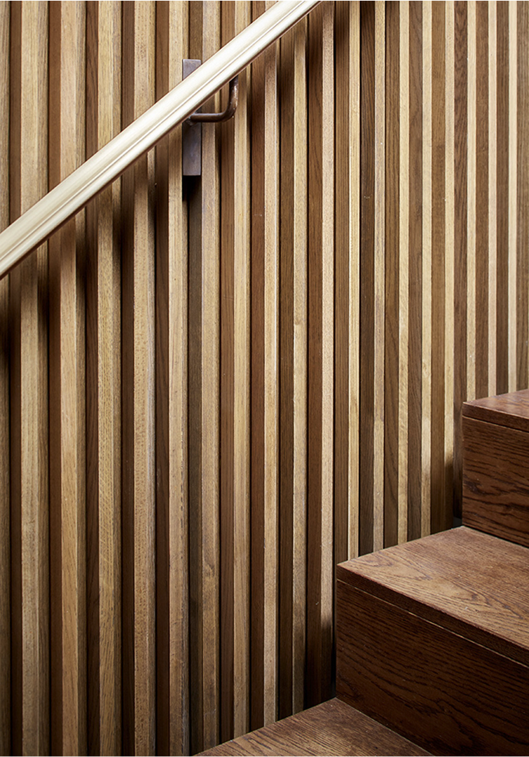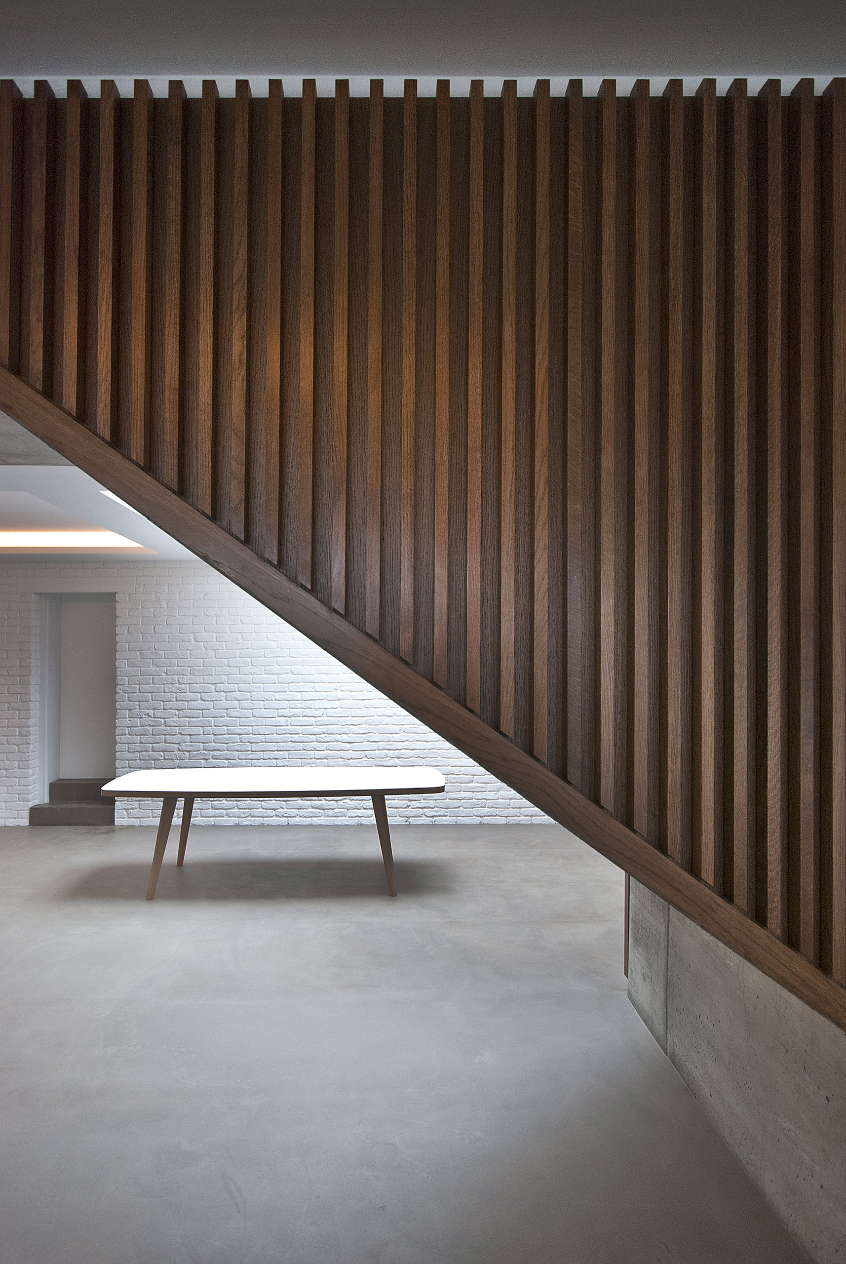 Brick is also the predominant material within the interior. As walls were moved, ground floor slabs lowered and ceilings pushed up to maximize the height on the ground floor, changes in the bond of the white washed brick walls mark the previous position of these elements. The result is a richly textured internal perimeter, imbued with the memory of place. This is contrasted with polished and rough concrete finishes, a coffered ceiling and Oak paneling.