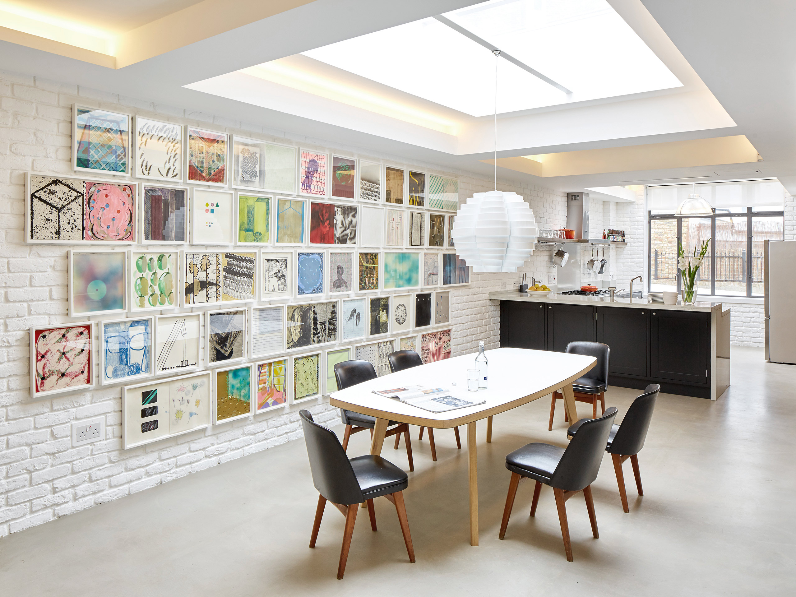 Dining and kitchen area with exposed brick materiality flooded with natural light from generous skylights